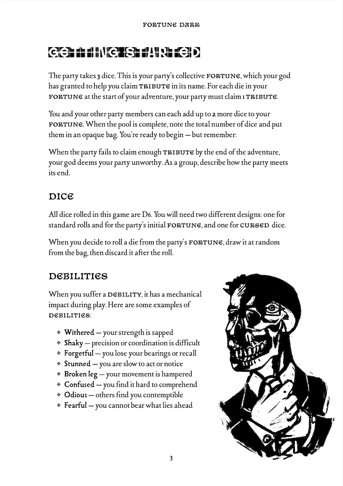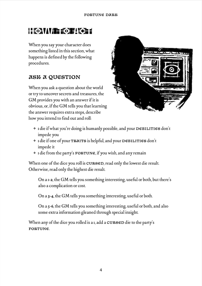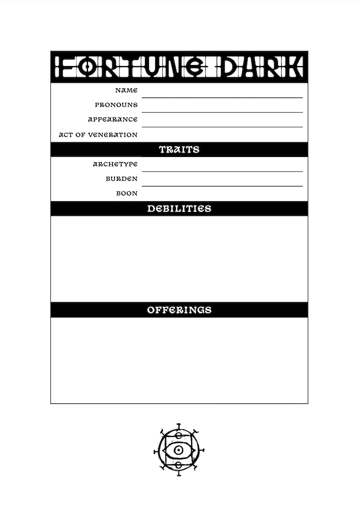In Fortune Dark, characters strive to gain treasure and glory against ever lengthening odds. Their shield is a dwindling pool of fortune, held by the entire party, which raises chances of success and is characters’ only recourse against the afflictions and harms they’ll suffer. But with every risky action comes the threat of cursing the fortune that should aid them. Fortune Dark sets out to make each individual’s choice affect the whole party, bringing tension and conflict amid the darkest doom.